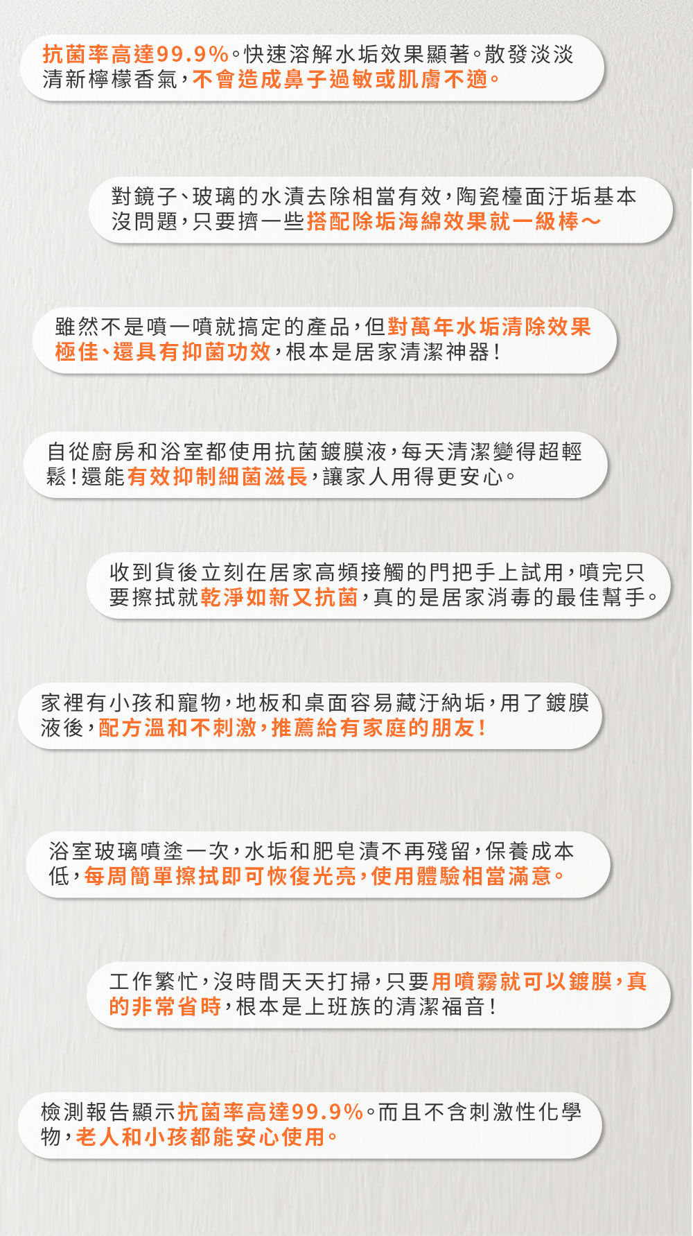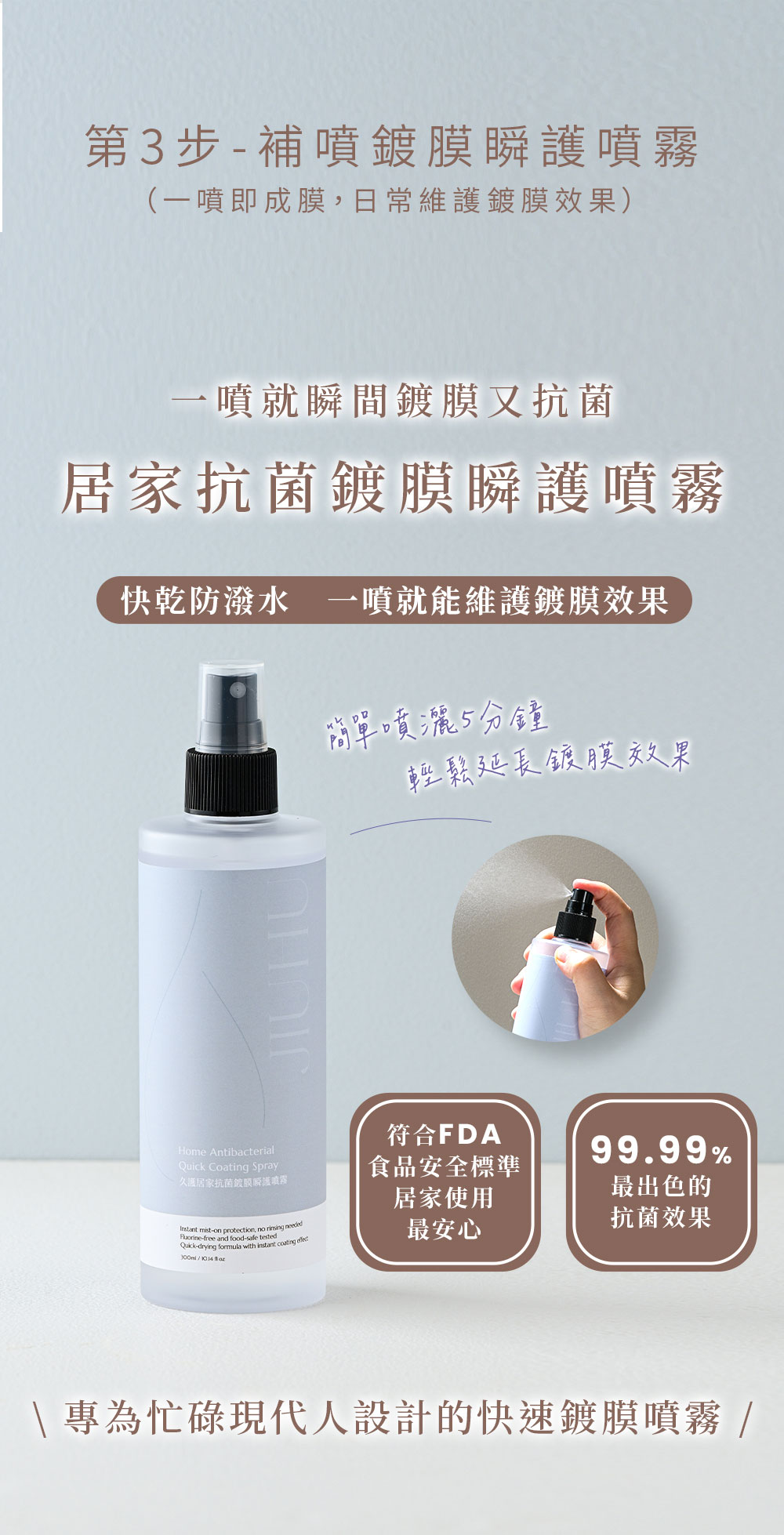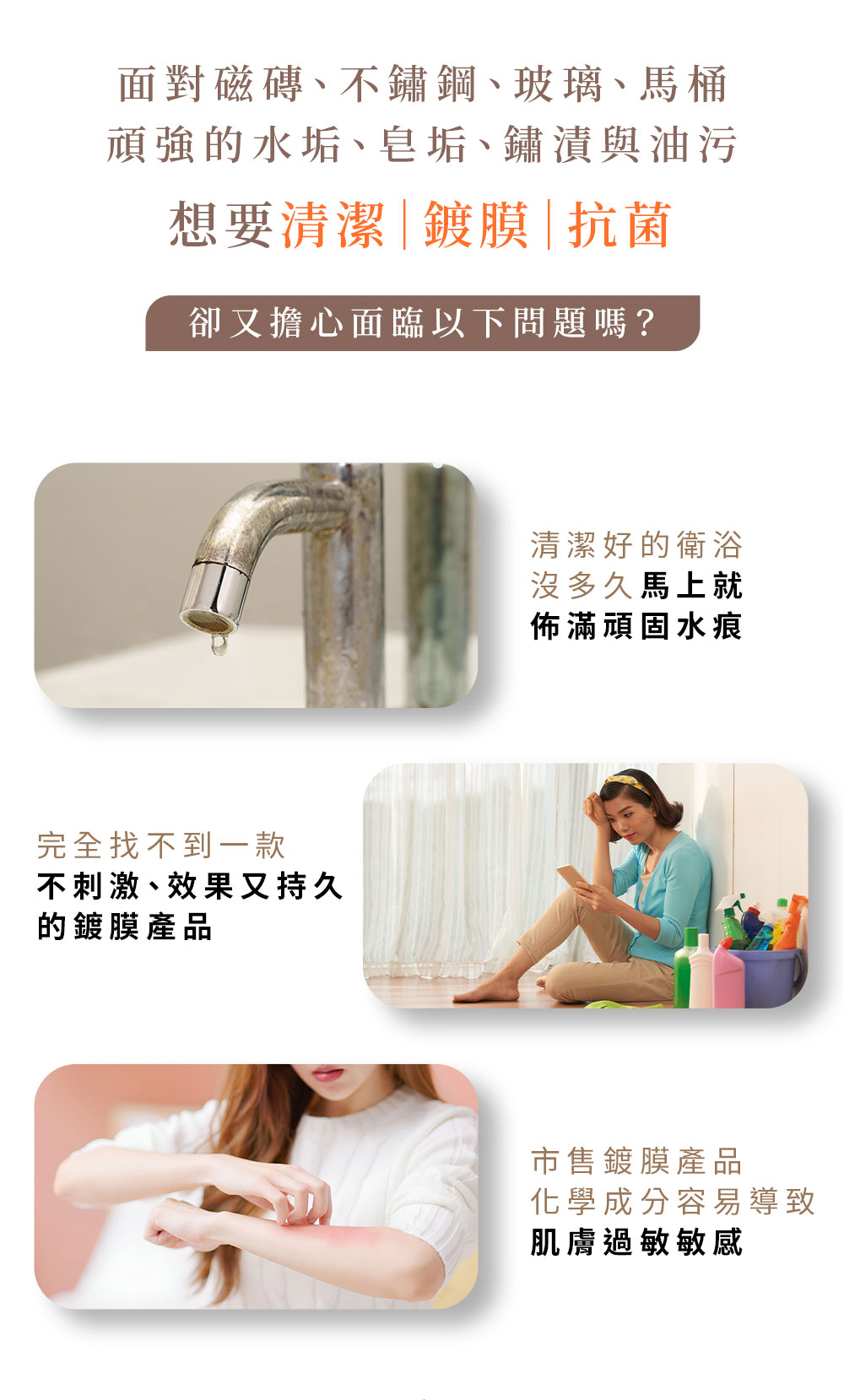 用途:形成防水抗菌鍍膜,適用於浴室、流理台、玻璃、五金等表面鍍膜使用。