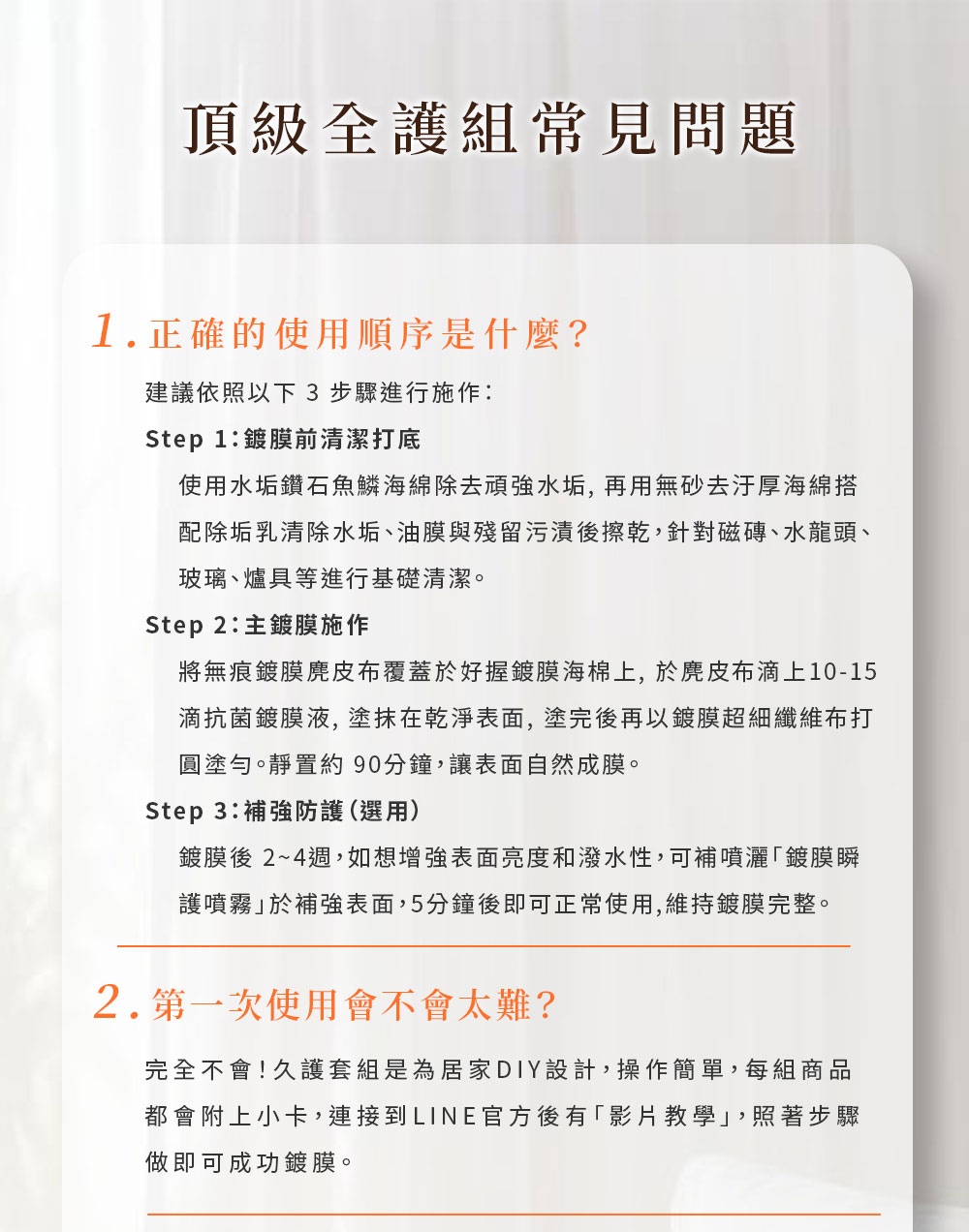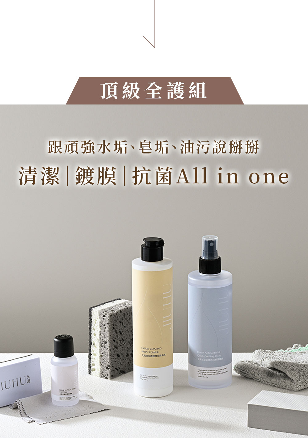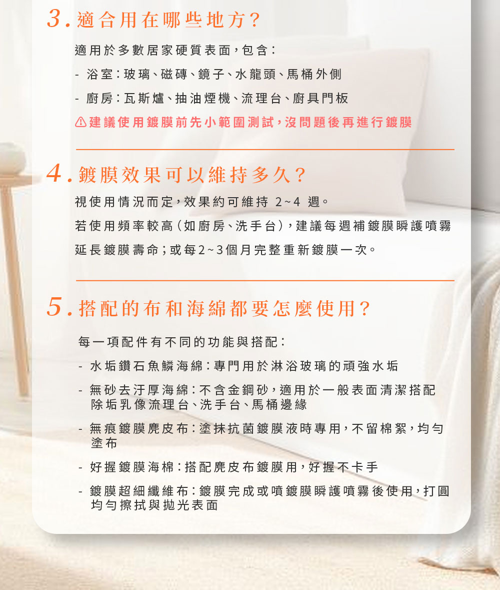 用途:形成防水抗菌鍍膜,適用於浴室、流理台、玻璃、五金等表面鍍膜使用。