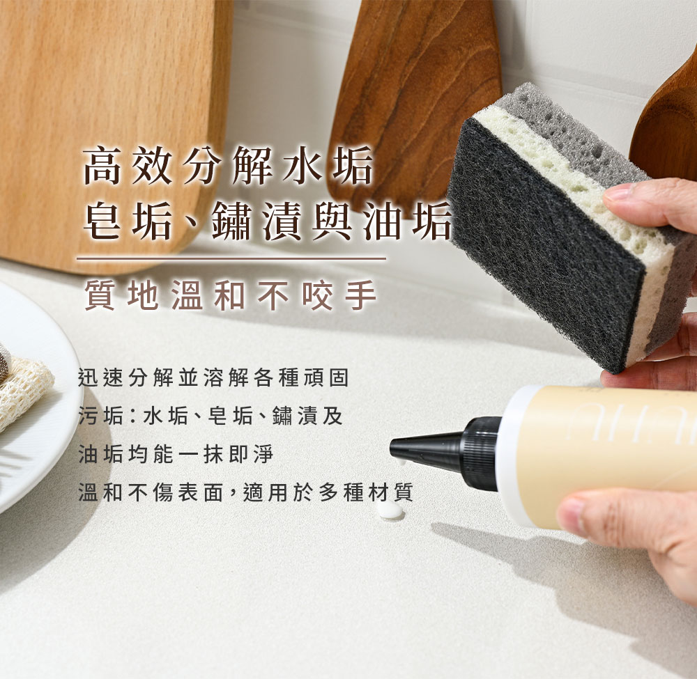 用途:去除水垢、皂垢、鏽漬與油污,適用於磁磚、不鏽鋼、玻璃、馬桶等表面清潔。